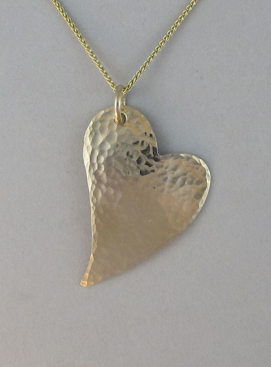 This 14K gold left hanging long heart pendant features a beautiful hammered texture and gently curving beveled edges. This rich and buttery heart pendant is simplistic in design, yet perfectly classic for the woman who doesn’t like to wear her heart on her sleeve.